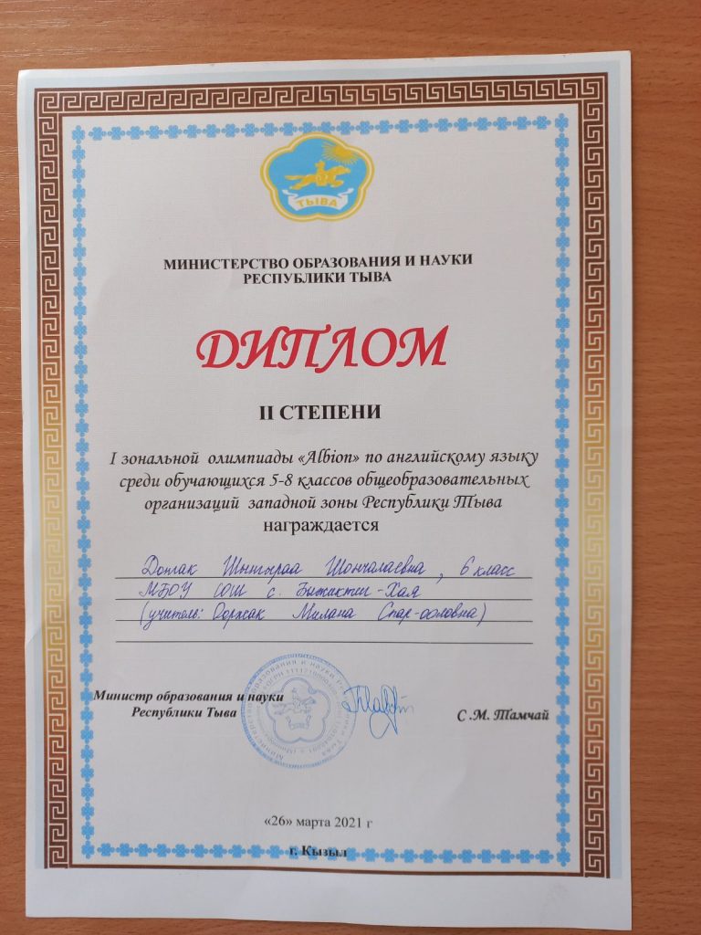 26 марта 2021 года на базе лицея «Олчей» г. Ак-Довурак состоялась зональная олимпиада по английскому языку «ALBION» среди учащихся 5-8 классов. В нем приняли учащиеся Бай-Тайгинского, Барун-Хемчикского, Дзун-Хемчикского, Сут-Хольского кожууннов. Нашу школу представляли Донгак Шынгыраа — ученица 6 класса и Саая Саян — ученик 5 класса. В результате Донгак Шынгыраа заняла 2 место среди учащихся 6 классов. Поздравляем призера Донгак Ш.Ш. и учителя английского языка Ооржак Милану Спар-ооловну за достижения учащихся