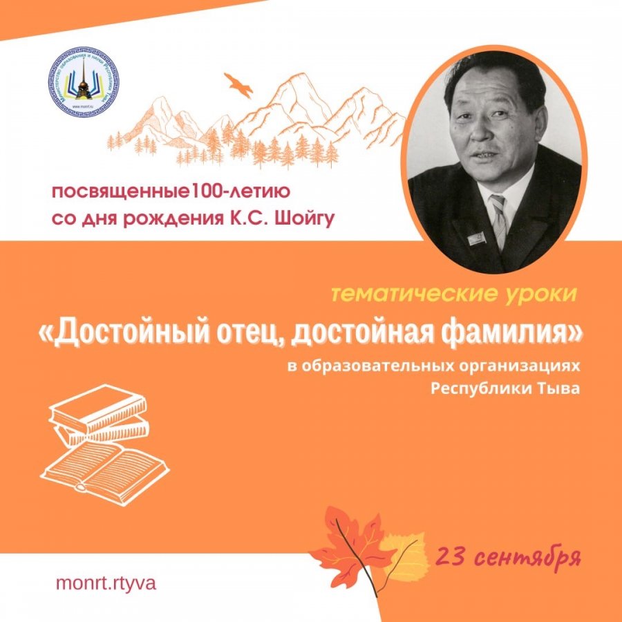 Врамках празднования 100-летнего юбилея со дня рождения государственного деятеля Шойгу Кужугета Серээевича, отца министра обороны Российской Федерации, Героя России Сергея Кужугетовича Шойгу, 23 сентября, в образовательных организациях пройдут тематические уроки «Достойный отец, достойная фамилия».