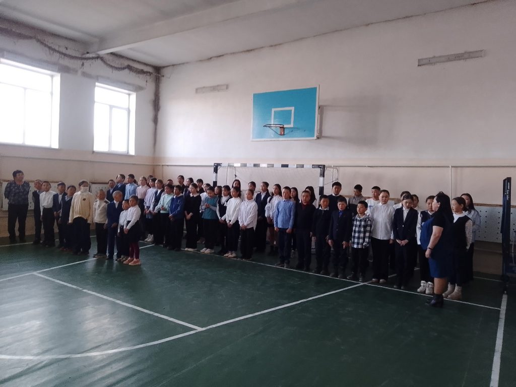 Поднятие флага РФ и исполнение гимна РФ.Всего охвачены 67 учащихся.