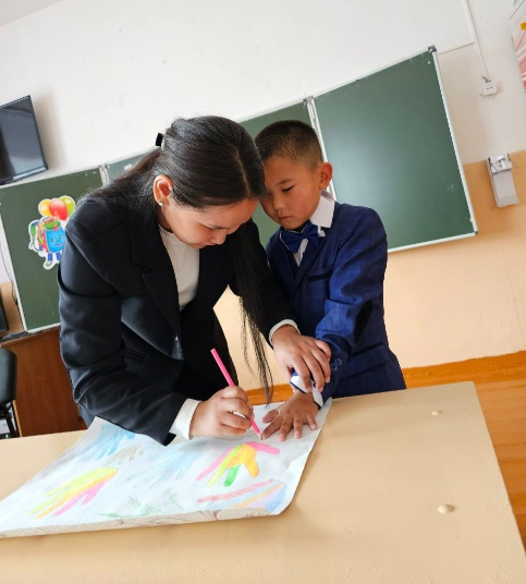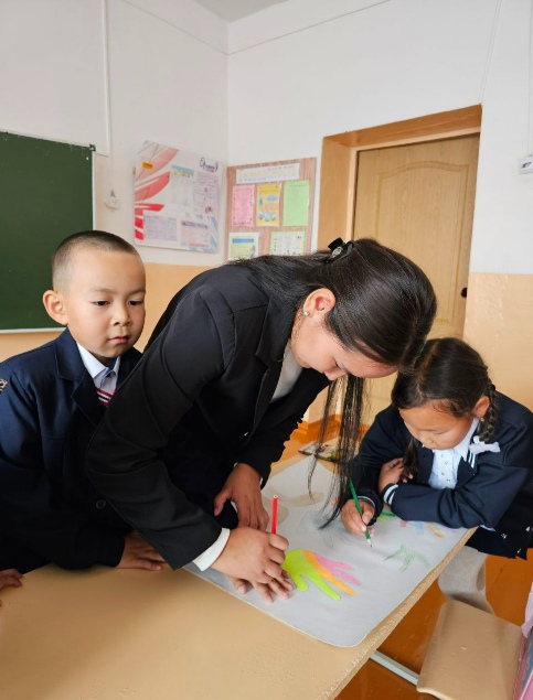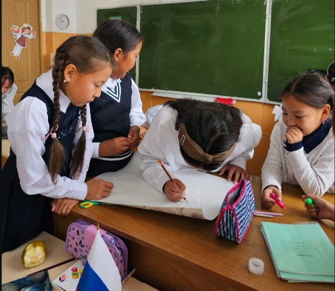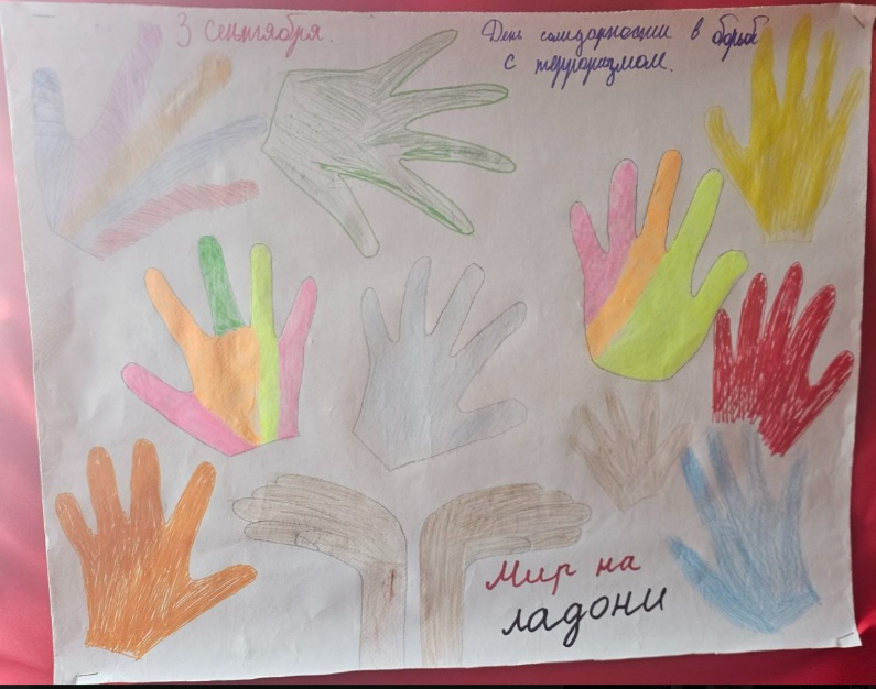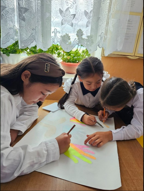 Советник директора по воспитанию и взаимодействию с детскими общественными объединениями совместно активистами школы и обучающимися начальных классов приняли участие в акции «Мир на ладони». Выполнили рисунок, на основе которой обведенный контур ладоней.