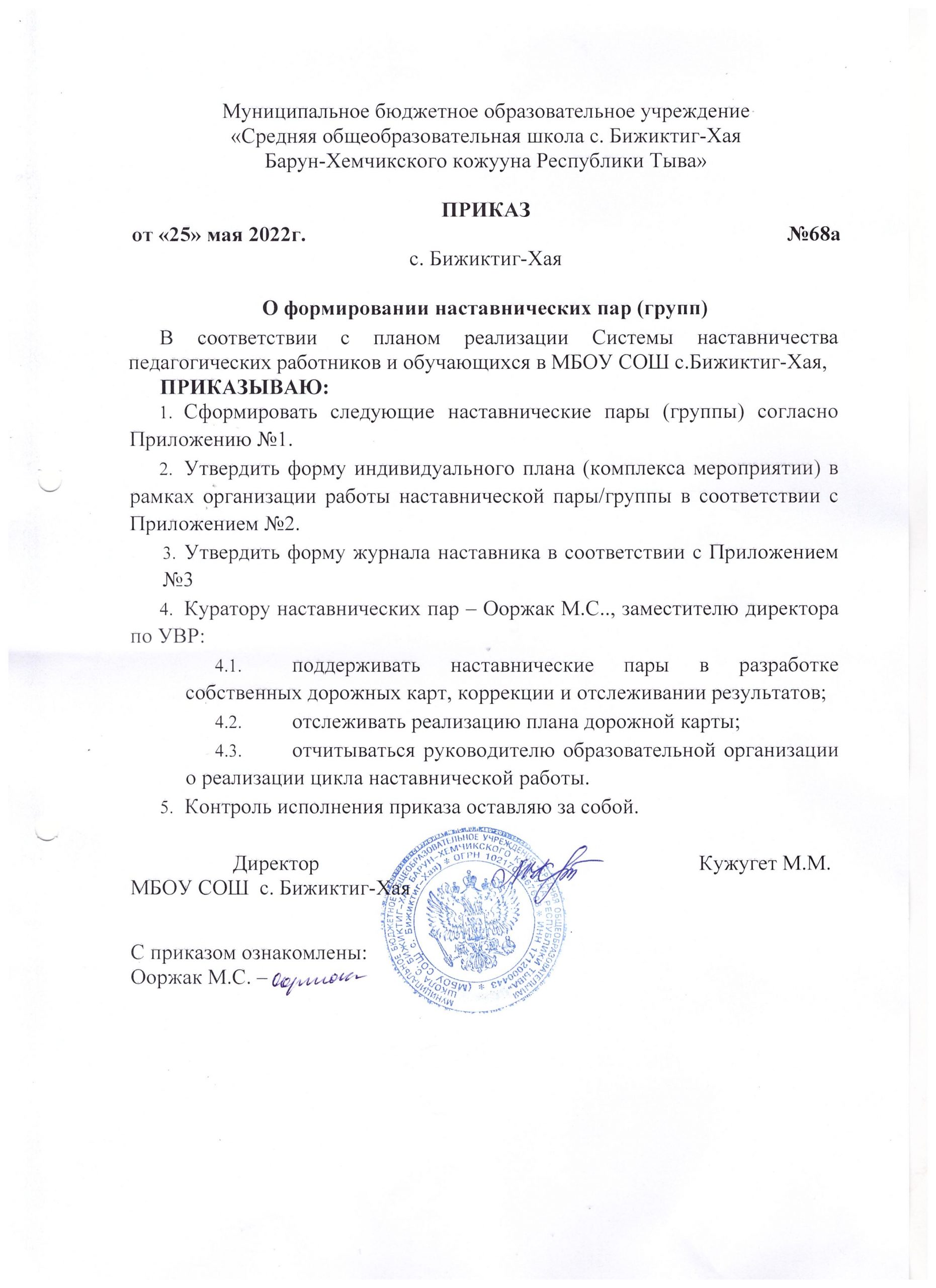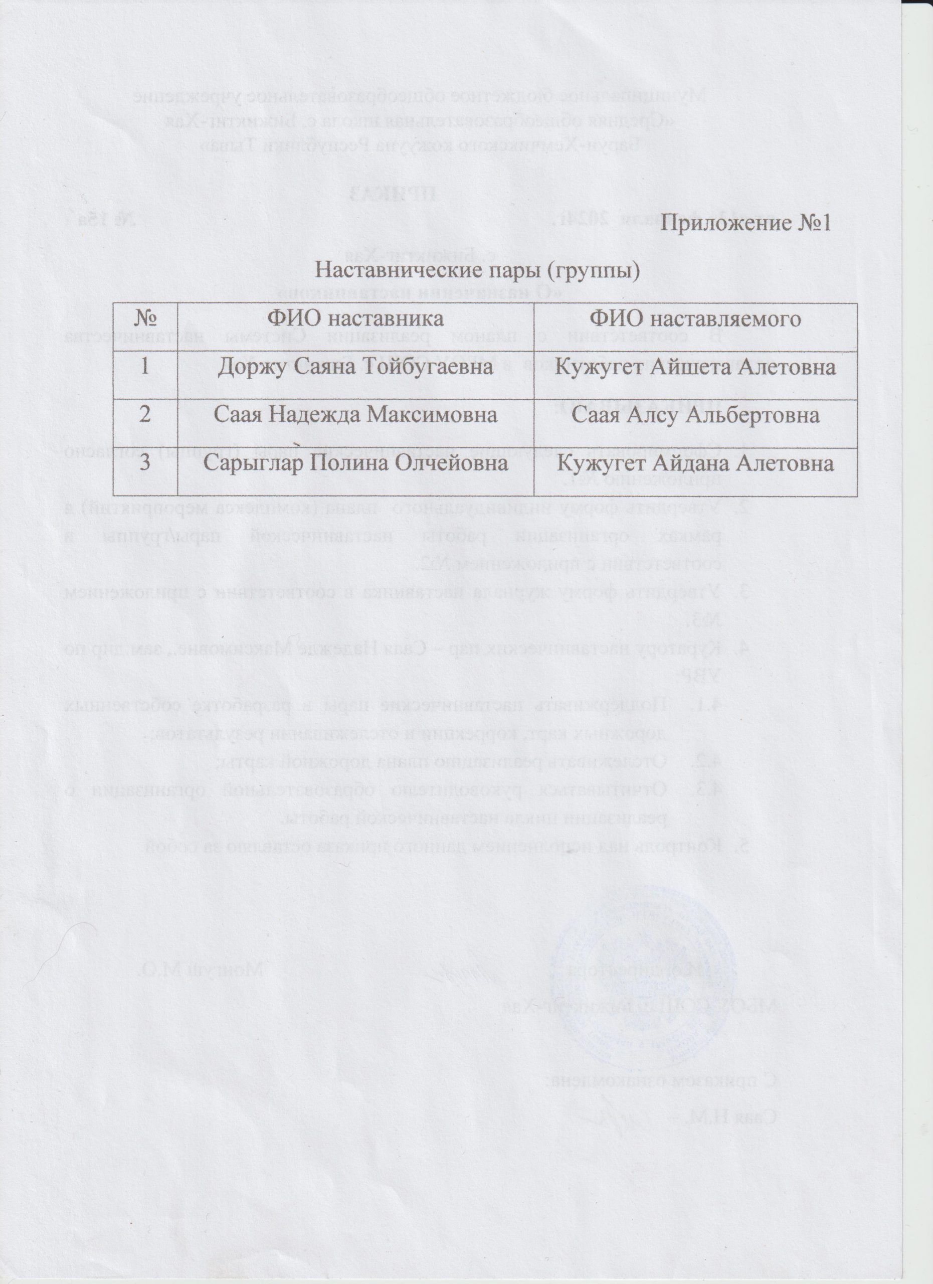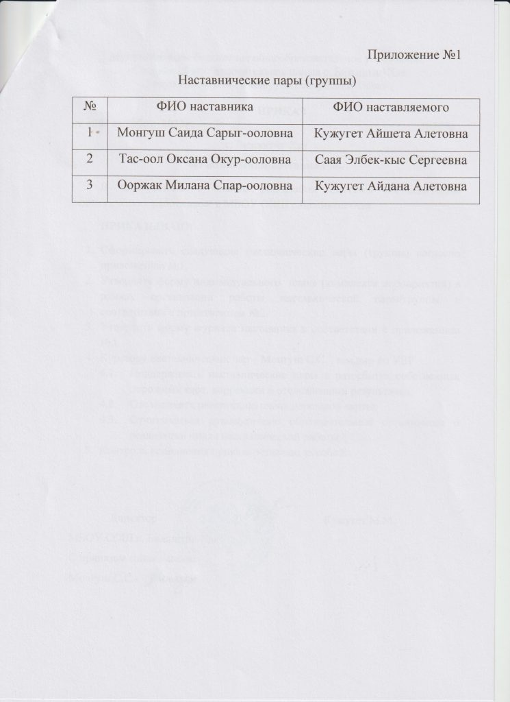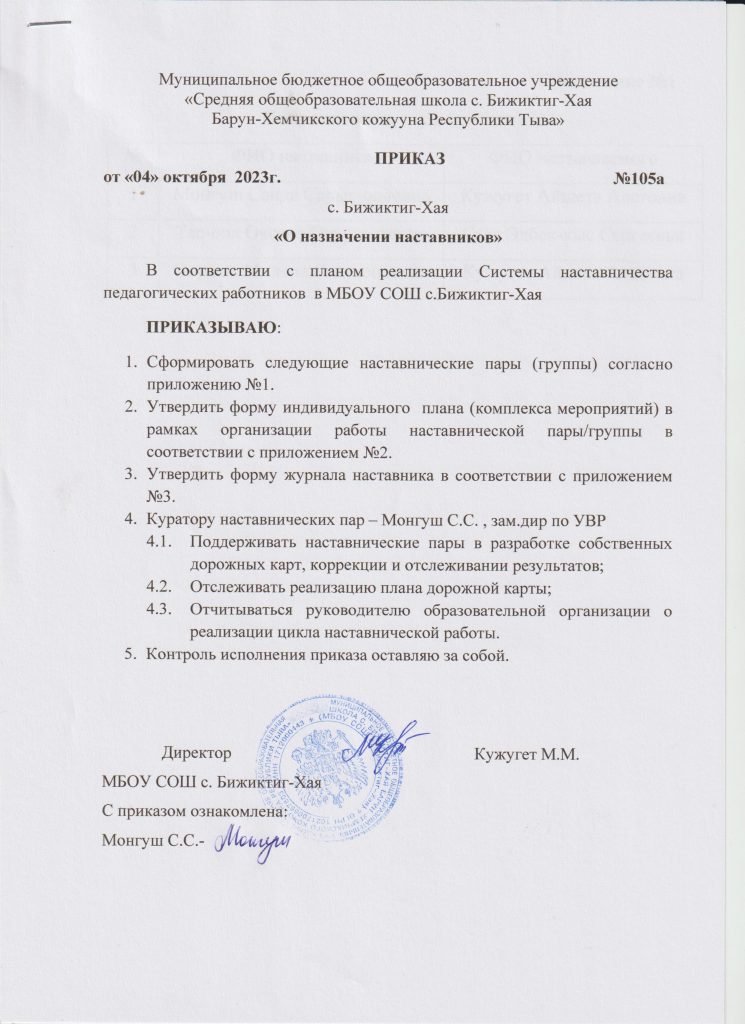 Наставничество Приказ №15а от 13.02.2024 г «О назначении наставников»Скачать Приложение «О формировании наставнических пар»Скачать Положение о целевой модели наставничества педагогических работников и обучающихся в МБОУ СОШ с.Бижиктиг-ХаяСкачать Положение о системе наставничества педагогических работников и обучающихся в МБОУ СОШ с.Бижиктиг-ХаяСкачать План мероприятий (дорожная карта) внедрения Целевой модели наставничества педагогических работников и обучающихся МБОУ СОШ с.Бижиктиг-Хая на 2022-2023 учебный годСкачать Приказ №67а от 25.05.2022 г «О назначении наставников»Скачать Приказ №68а от 25.05.2022 г «О формировании наставнических пар (групп)»Скачать Приложение 1 приказа №68а от 25.05.2022 гСкачать Приказ №65а от 20.05.2022 г «Об организации работы по внедрению Муниципальной целевой модели наставничества педагогических работников и обучающихся»Скачать